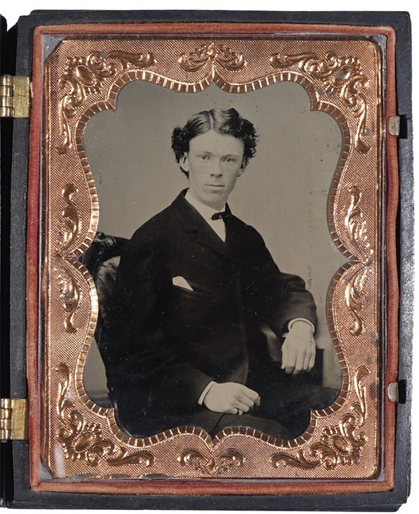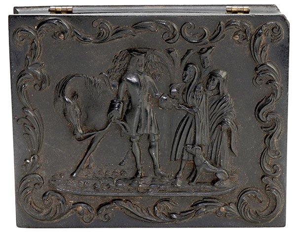 The ambrotype above, featuring this young man with a very firm and assured gaze, came packaged in a finely finished gutta-percha case. The lid has a bas-relief depicting the scene from a well-known story called the “Falconer’s Bounty”. A nobleman loses his falcon during a hunt, but a peasant girl finds the precious animal and returns it to its owner. We see the boy on his horse offering a cash reward for the lady’s good deed. Is there a connection between the boy in the picture and falconry? Perhaps he chose a theme linked to generosity? It’s impossible to know.
