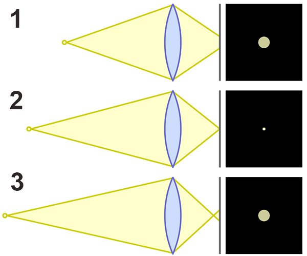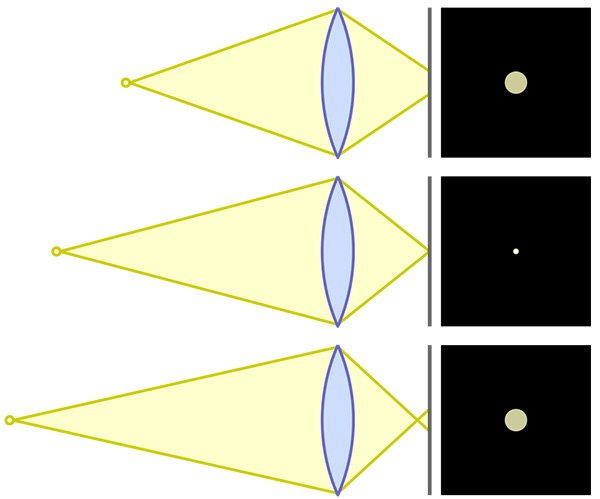 If you are a little ahead or a little behind the ideal focus point, this point will look like a disk. This is because the cone of light coming from the lens is cut off. This disk is what we call the Circle of Confusion, or CoC as it often appears in the literature. The diameter of this disk is the measure of the CoC.