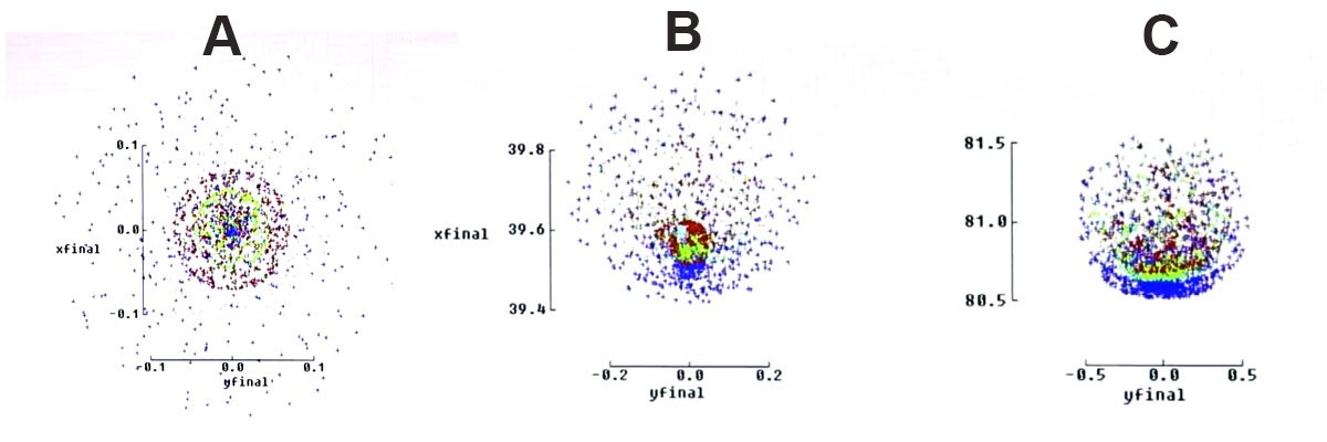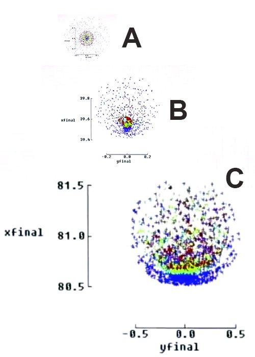 The above figures correspond to approximately 4,000 rays that have passed through the lens and would make these figures on the film or sensor in a real situation, but with the caveat that we wouldn’t see dots but spots because they would be like infinite rays and not just 4,000. The x and y scales give the actual size of these spots in mm, which are like photographs of the Circle of Confusion. The three situations shown correspond to: