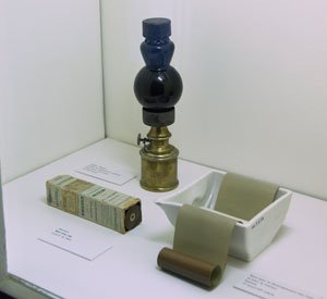 Developing tank for roll film before the spiral and a safe light before electricity.