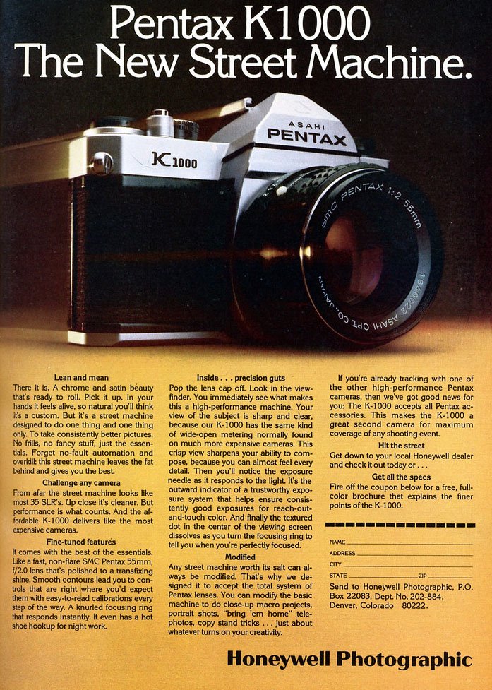 With these characteristics, Pentax wanted to be a benchmark in the education market and compete, for example, with Veb Pentacon’s Prakticas. Its simplicity, durability, low cost and clear manual controls made it the student camera par excellence for decades. Countless photography courses used the K1000 as a standard teaching tool. It was already on the list of materials for students.