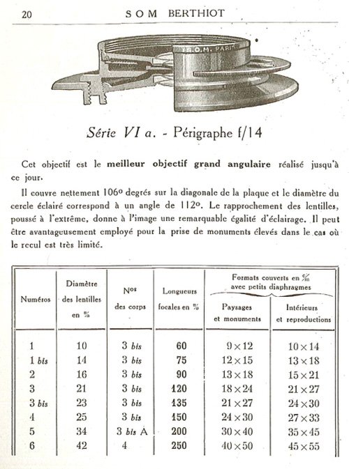 The Perigraphe anastigmatic was marketed in two series VI a and b, the first at f/14 and the second at f/6.8. In both cases, the diaphragm is a rotating disc. The image circle corresponds to an angle of 112º. No. 3, which has a focal length of just 120mm, covers a frame measuring 18 x 24 cm. On the page of the SOM Berthiot catalog, reproduced above, we read that it is suitable for photographing “very tall monuments in cases where it is not possible to be very far”. An equivalent wide-angle lens for a 35mm film camera with a 24 x 36 mm full frame would have a focal length of 15 mm.