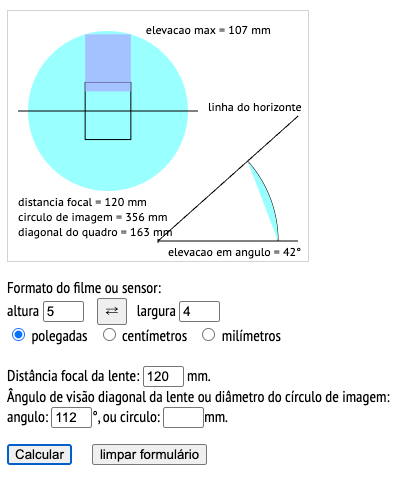 In the Fundamentals room here at the museum, there’s a calculator under the Tools tab that tells you how much you can raise the lens plate depending on the focal length and its image circle or angle of view. In the print screen above, we see the 120 mm of this Perigraphe and the 112º of the SOM Berthiot catalog calculated for the 4 x 5″ format. You can raise the lens 107 mm! It goes up so much that the horizon line is well below and out of the frame, as we see in the drawing.