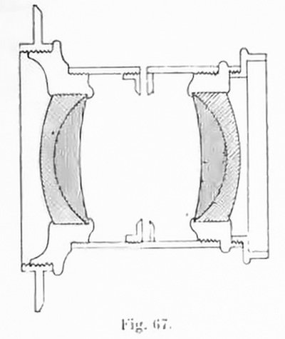 The basic design consists of two identical cemented doublets symmetrically positioned. Between the two is a diaphragm that was initially of the Waterhouse type and later an iris.