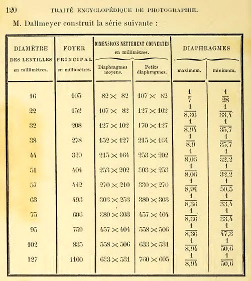 According to this table in Charles Fabre’s 1889 Traité Encyclopedique de Photographie Tomo I, being the lens in the collection a 44 mm (lens diameter), it is the one in the 5th row. So it has a focal length of 329 mm and makes a frame of 215 x 164 mm. The Waterhouses range from f/8 to f/32 (rounded).