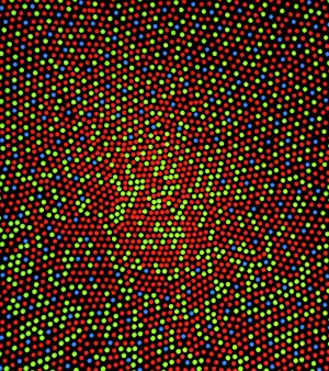 Above is a graphic representation illustrating the distribution of light-sensitive cells in the human eye. They are more concentrated in the center, in the fovea, and more dispersed in the periphery. They are also sensitive to different wavelengths: red, green and blue. If this is too strange for you, read about Light and Colors, what is physical and what is human. But for this article the important thing to know is that they are individual cells and not a uniform medium.