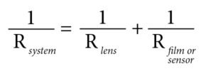 The final resolution on the film or sensor, in the case of photography, is the result of combining the resolution of the film or sensor itself under ideal conditions, depending on its physical characteristics, like the size of the silver grains or the geometry of the pixel grid, with the resolution of the lens, also under ideal conditions, in relation to the circles of confusion it produces.