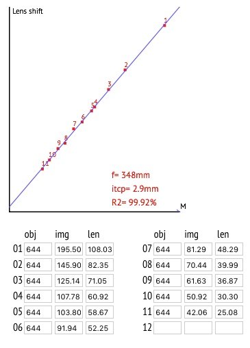 The focal length of this specimen in the collection was measured by linear regression and gave a value of 348 mm, as shown in the graph below.