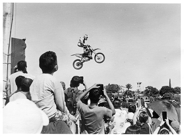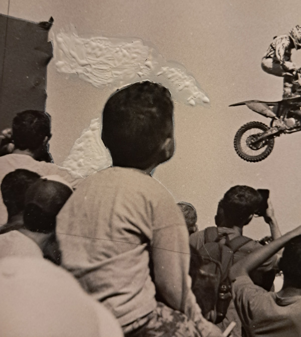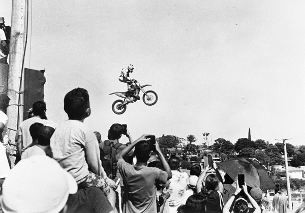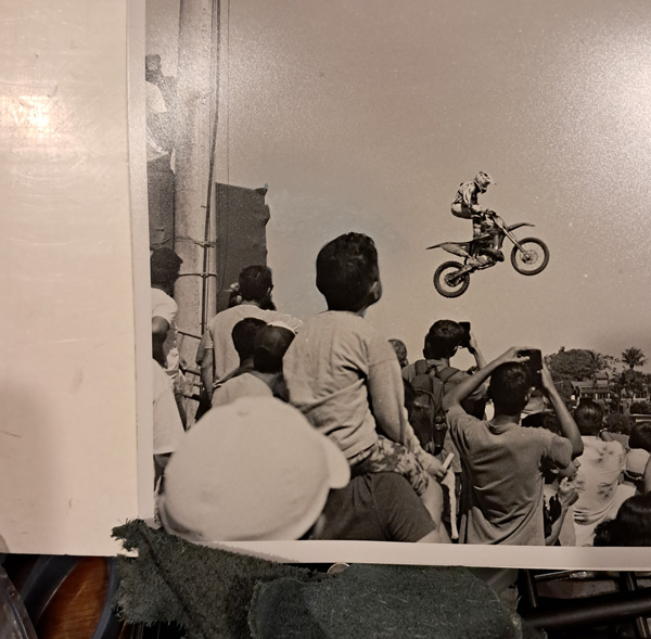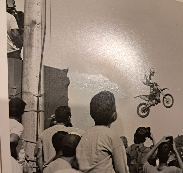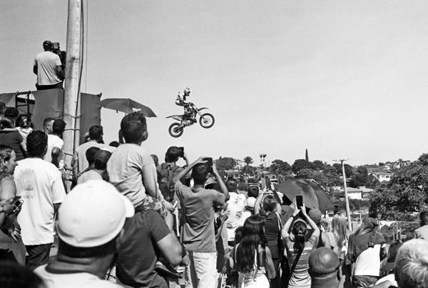 Para mim, o ponto interessante nela é a interação do menino com a moto . Embora não vejamos seu rosto, a posição e atitude tão relaxada dele nos leva a crer que ele estava encantado com os saltos dos motociclistas. O que atrapalha muito é a sombrinha que embora bem mais distante fica sobre a cabeça dele. Ela está interferindo demais e pensei que seria muito bom se pudesse sumir com ela e também cortar um pouco da paisagem, como se estivesse com uma lente mais longa. Para simular no que isso daria, fiz isso no Photoshop e obtive o resultado abaixo.