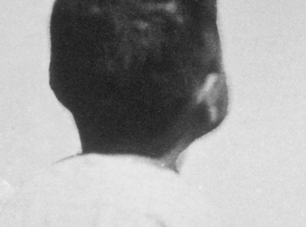 Acima temos um scan da impressão final em 15 x 20 cm. Sabendo-se do retoque e observando-se atentamente os contornos na cabeça do menino pode-se notar algo estranho, como se vê no detalhe abaixo. Ele é do mesmo scan acima, realizado em 600 dpi. Mas, para fins de exibição, para pessoas que não sabem que a foto foi retocada, ou para a minha memória desse menino encantado com o show dos motociclistas em um domingo ensolarado, a foto final é muito mais efetiva e afetiva que a original.
