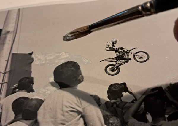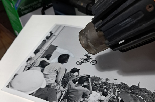Neste ponto, conforme o ângulo que se olhe, praticamente não notamos o retoque. É o que mostra a foto acima. O que mais destaca o retoque do seu entorno é o fato de que o cinza ficou um pouco mais frio que o cinza do papel. Mas essa diferença irá sumir quando ela for re-fotografada pois o filme preto e branco não será capaz de registrar uma diferença tão sutil.