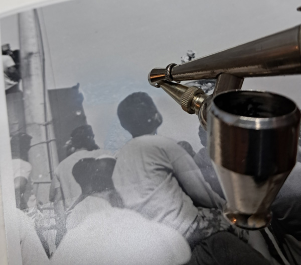 Por mais que a tonalidade de cinza esteja adequada, sempre fica uma passagem dura entre a parte pintada e o fundo original. Para esmaecer essa transição um aerógrafo é o ideal. Usando a mesma tinta, com ele pode-se fazer um degradé suave. Foi nessa hora que a máscara se fez realmente necessária para proteger o que não poderia ser pintado.