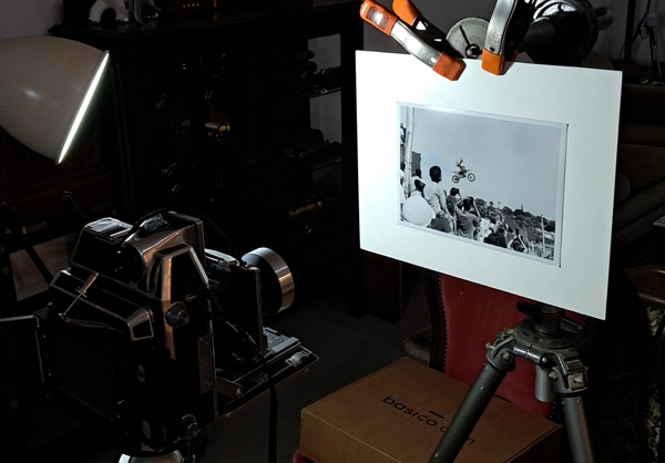 O negativo original foi feito com uma Leica M3, como já foi dito, isso quer dizer que se trata de um 35mm no formato 24 x 36 mm. O ideal para se produzir um novo negativo é que este seja maior pois a imagem em papel tem muito menos detalhes e brilho que uma imagem real. Um negativo grande renderá melhor esses detalhes e o seu grão tenderá a não interferir na cópia final.