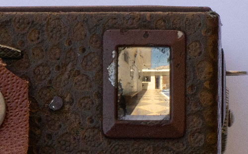 Because it has a rectangular frame and uses viewfinders for framing, two viewfinders are present to allow portrait and landscape orientations. They are very small, made up of two lenses and a 45º mirror. It is not very easy to see what you are framing depending on ambient light conditions. In general, we choose what will be in the center and we have an idea but not very precise control of what is framed in the corners. Another characteristic that is not very easy to deal with is that the image appears inverted right x left.
