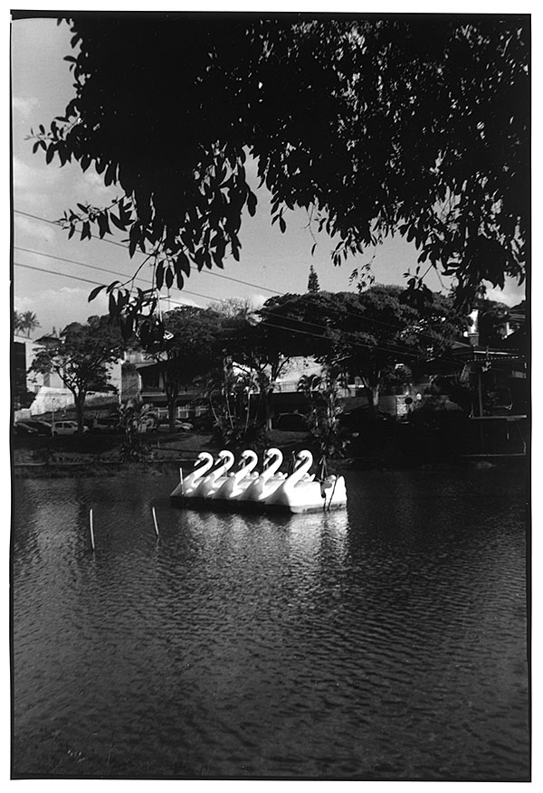 This is an entire negative and the aperture was f/22 handheld. I pass by this lake very often. I was hoping for a day when the sun would give more emphasis to the “swans”, leaving the rest more in the dark. They move in the lake, depending on the current. I was also hoping for a day when the light and their position would allow this half-profile view with all of them lined up. On the day I went to try out the Beau Brownie, the meteorological and celestial conditions were favorable and I was able to take this photo, which for me has a certain affective value because I have already taken delicious walks there.