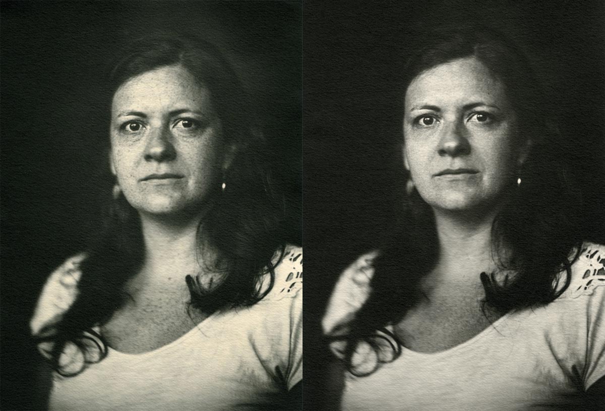 Side by side above we have the same negative printed before and after retouching. Much has been discussed since the beginning of photography, and it is discussed to this day, about as far as retouching can go. In absolute terms this is a sterile discussion. It is as if there would be a fair and reasonable boundary for retouching beyond which it would be reprehensible. There is no such universal rule separating the false from the authentic in photography or any means of imagery representation. In the example above I just intentionally tried to avoid an artificial look that would make the image strange and in conflict with the straightforward style of the portrait. For that, I almost only took care of the spots due to the limited reading of the spectrum that this homemade emulsion provides. I think the action is more discreet, less astonishing the difference “before x after”, but the “after” alone, which was the ultimate goal, is more balanced and beautiful.