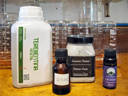 The ingredients are turpentine, damar gum and lavender essential oil. Note that white spirit replaces vegetable turpentine in many applications, but NOT for the preparation of Dope, as only vegetable turpentine dissolves Damar gum while white spirit does not.