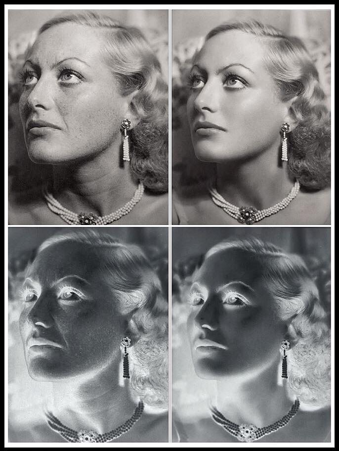 Joan Crowford photographed by George Hurrells and negative retouched by James Sharp – 1931. I believe that the many spots on the actress’s complexion would not be visible, or would not be so striking, live. It must have been the recurring problem of photographic emulsions not sensitive to red that makes them so prominent.
