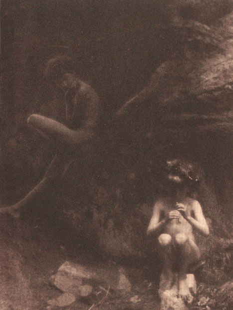 Photograph of a mythological scene created by the American photographer Clarence Hudson White (1871–1925), in 1905, with the title Pan Flute. Typically romantic theme and setting with a fundamental contribution of some soft focus lens. Pan, in Greek mythology, was the god of the woods, the herds, and the shepherds, all of them very dear to the territory of romanticism.