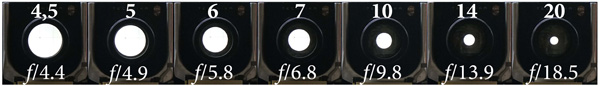 These numbers, 4.5 – 5 – 6 – 7 – 10 – 14 and 20, are questioned in photography forums and I found different interpretations. So I decided to effectively measure the entrance pupil in each step and calculate the apertures in f numbers. I used the method described in this link. The results are represented in the image below. The top row are the numbers indicated on the lens ring and the bottom row the calculated apertures.