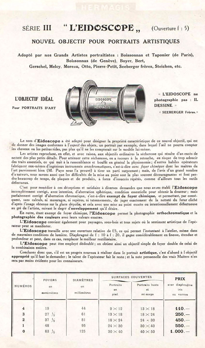 “Other skilled operators make themselves ingenious chemically-focused, anachromatic instruments, with which the masters of art come up with surprising results (as M. Puyo proves), but we know that it is also the opinion of a large number of amateurs that focusing difficulties are the most frequent reasons for discouragement and waste of time, plates and products due to repeated failures, as is the case with all defective tools. It is to remedy this disappointment and to satisfy the various demands that we have launched Eidoscope, purposely incompletely corrected for spherical aberration, an essential condition for obtaining the smoothness, but perfectly corrected for chromatic aberration, that is, without chemical focus and thus allowing with no calculations, no measurements, no references, no groping, to judge exactly the sharpness of future photography to the artist’s liking and according to the degree of envelopment he wishes. In other words, being free of chemical focus, Eidoscope allows orthochromatic photography and color photography with exact values”.