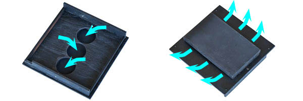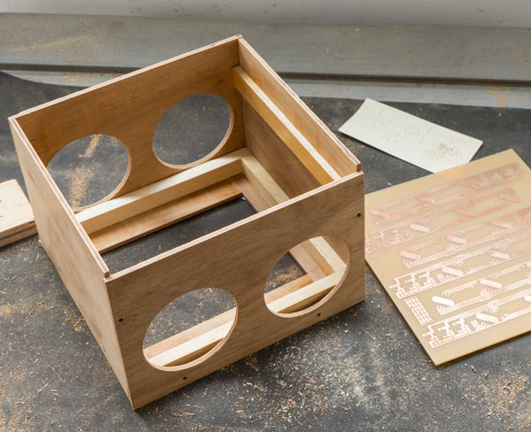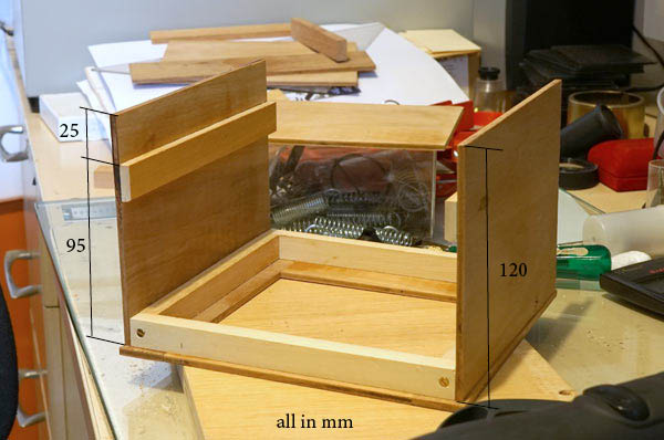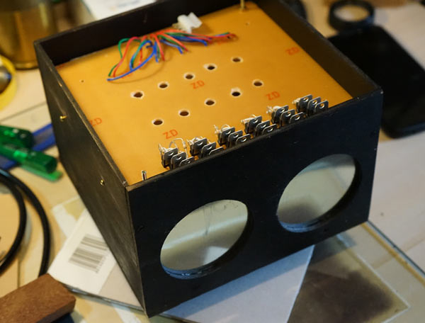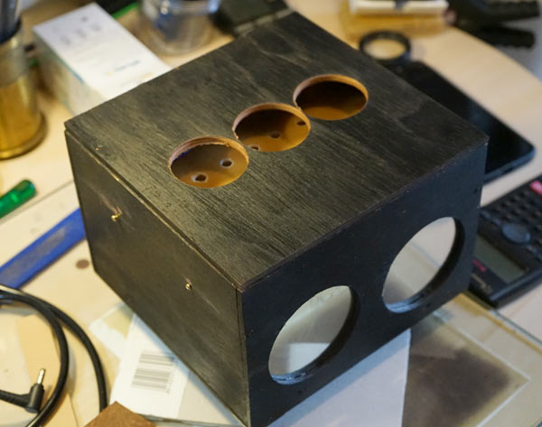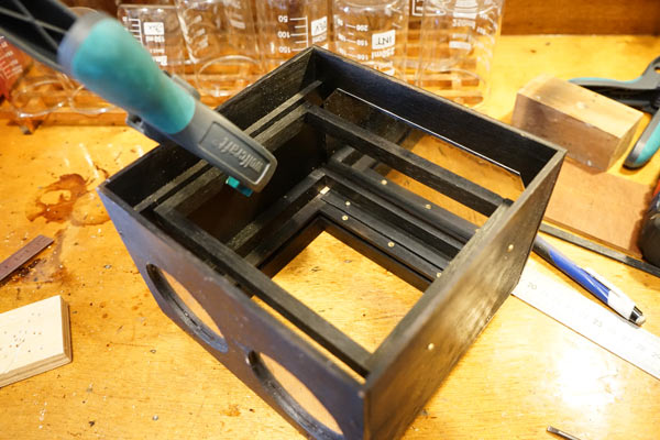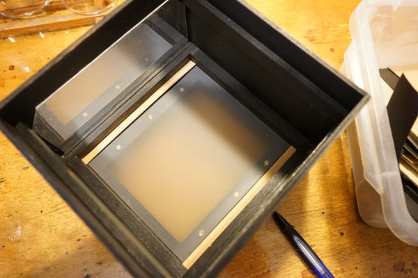 Finally I cut a lid that has a frame underneath so that it fits inside the box. The holes at the top are a vent for heat dissipation. A flapped lid was placed over them, taking care to avoid light leaks, but allowing the hot air to flow out.