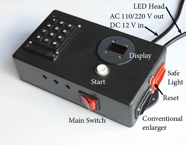 The design also includes a special timer to control this LED head and produce variable contrast when using multigrade papers. The timer also has two 110 / 220V outputs to control darkroom safelights and a conventional enlarger.