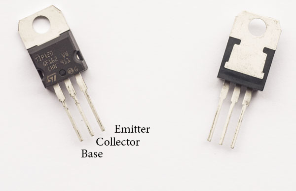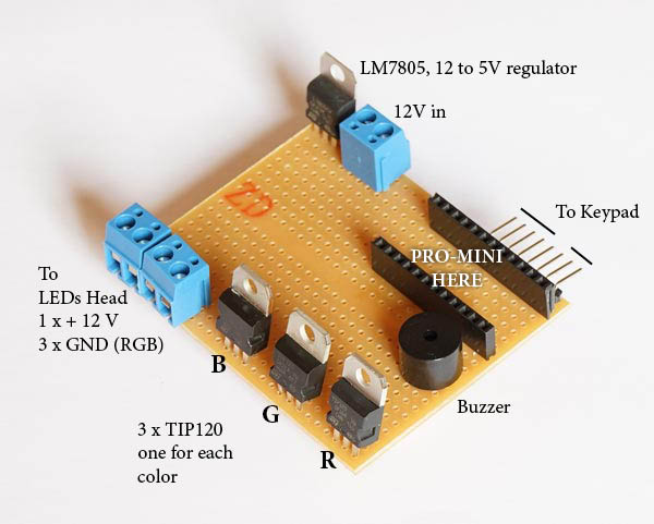 At the top of these three tracks, after passing through the LEDs, they are connected to ground (GND) in the control box. There are therefore 4 wires that connect the head to the control box. A common positive of 12 V and 3 “different” GND, one for each color. This can be a little strange because GND is also called “common” but here what is common to all is +. The point is that each GND will still pass through the TIP120 (explained below) and only then join to the final and common GND. In fact, it is not exactly a ground, like a ground that we connect to Earth, it is more the negative of the circuit. But we don’t need to go into those details.