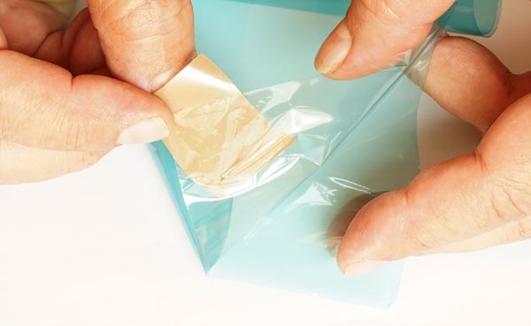 2. In low light, remove the protective film from one side of the dry film. The light-sensitive part is the blue layer. But it is surrounded, on both sides, by a transparent film that needs to be removed to apply the dry film on the copper surface. It is a little difficult to do this because the materials are very thin and malleable. I found that applying a piece of adhesive tape to one end and pulling it, this task can be performed more easily. That’s what I’m doing in the photo below.