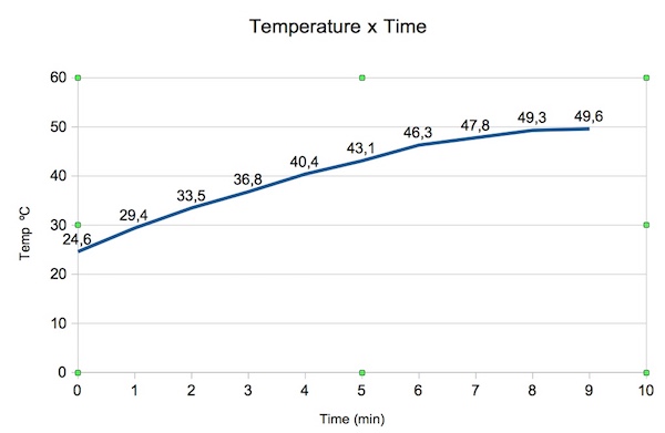 7. In line 64 you have: focus_power = 125. This determines the power of the focus light. As seen above, this value can go up to 255. I advise leaving half, or less, if possible, to avoid overheating. The focus with white light is the moment when the head can reach its greatest power, as the three colors are activated without the seesaw effect between blue and green, explained above. This focus_power is the variable that defines how far that power goes. In the head I built and with focus_power = 125 (half load), I measured the temperature rise in the air near the LED board, under working conditions, and found the following heating curve: