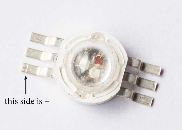 The LEDs chosen are 3W RGB, with 1W for each color. 6-legged LEDs were chosen, that is, a + and an – independent for each color. The circuit does not work if you buy a 4-legged RGB You would have to redraw everything. They are easily found online and are probably all the same. Anyway, here follows a more detailed specification for the ones I used in this specific assembly:
