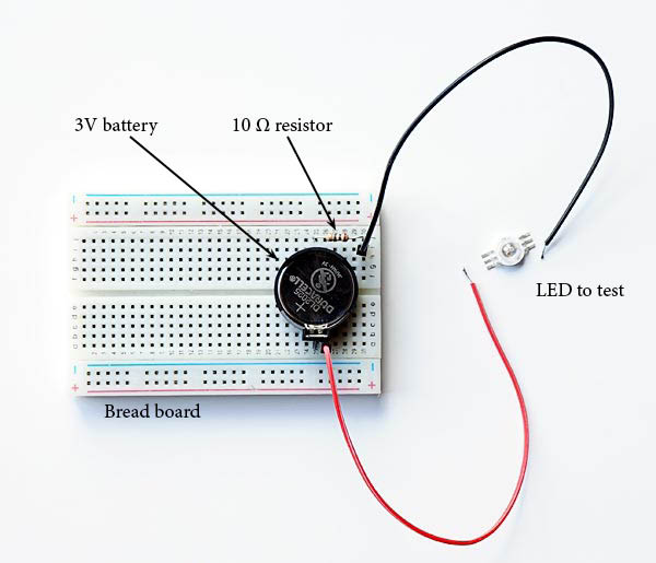 The circuit is simple and can be assembled quickly with a small breadboard as pictured above and a battery holder. They are sold in stores that work with Arduinos and robotics. Just plug in the 3V battery holder, the type that is soldered in PCBs, connect a 10Ω resistor in series and see if the led lights up when it closes the circuit.