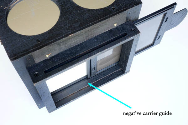 The base of the box provides an upper guide to the negative holder, but it is interesting that you also place a lower guide by gluing it to the frame that attaches to the camera. A 3 mm thick clapboard, marked in the photo as a negative carrier guide, solves this problem.