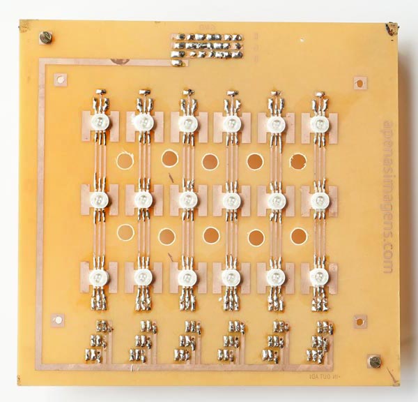 There are firms that produce PCBs for prototyping in small quantities and even a single copy. Using one of them can save a lot of time and work. The circuit design can be found in pdf in the file apenasimagens_led_rgb_V1.zip. I included there this one featured in this post and also a second one for medium format – having only 12 LEDs. I don’t know if those producing PCBs accept .pdf but if not, there must be some type of converter for the format they use. Some research is needed.