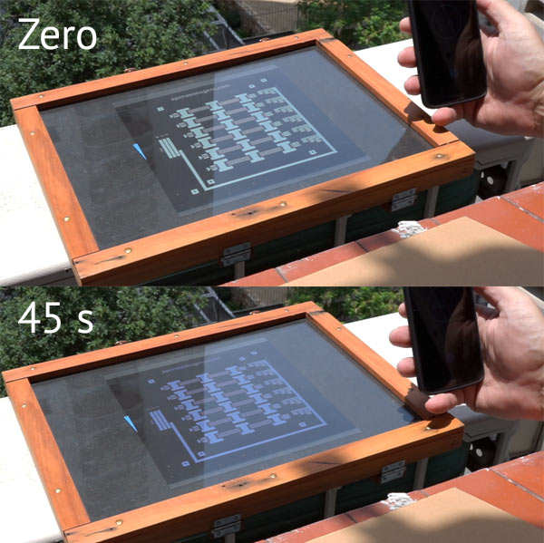 6. If the adhesion is good and uniform, place the photolithograph on the dry film, pressing it with a glass plate. A contact printing press is ideal. The photolith has its right side. apenasimagens.com must be legible to make sure it is in the right position. Expose to the sun until the blue is dark. In very strong sunlight it takes only 45 s. The danger of overexposure is that the thin spaces between the tracks also start to harden and the sodium carbonate solution cannot completely remove these partially hardened dry film interstices. Do not overdo the exposure.