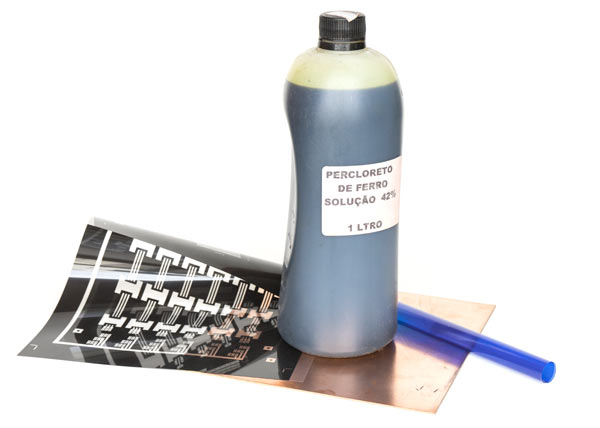 The dry film is applied over the copper of the plate and the photolith goes over it. Then it is exposed to the sun or another source of UV light. The parts that receive light darken. The parts that do not receive light remain clear and soluble in a sodium carbonate solution. The board is bathed, thus exposing the copper of the plate to the parts that have not received light. Then it is immersed in the iron perchloride solution and it will attack the copper removing it completely on the not protected areas. As the tracks are still covered by the dry film, the plate must be placed in a sodium hydroxide solution to remove the dry film that has darkened / hardened, thus finally exposing the copper tracks that form the circuit. To finish it is necessary to drill the holes where the wires and components will be placed. Watch the video to see the end-to-end process.