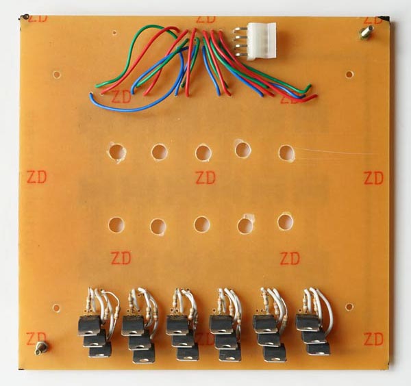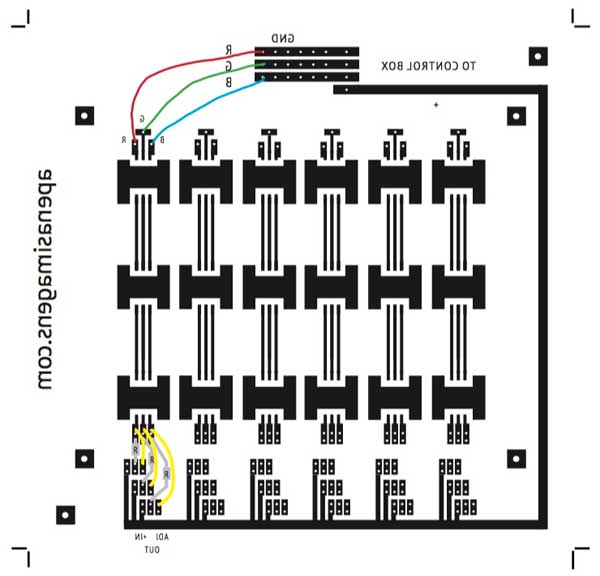 The three tracks that arrive at the LEDs underneath (in the drawing above) are therefore positive and already duly modulated in a safe current range for the LEDs. Each corresponds to a Red, Green and Blue color.