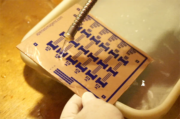 10. At this point, only the dry film cover that protected the tracks remains to be removed. This is done with a sodium hydroxide solution (30g in 1 liter, or follow your supplier’s instructions). After a few moments the dry film starts to come off. Just gently shake the tray taking care not to spill the solution where it should not, after all, even though it is not a strong solution, it is caustic soda. This solution must be discarded.