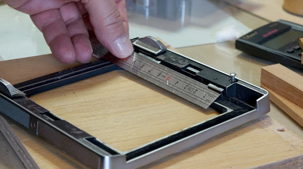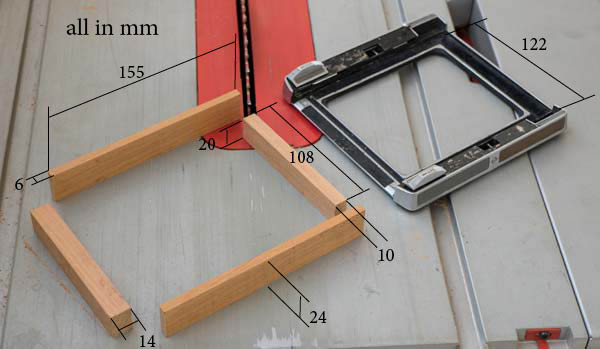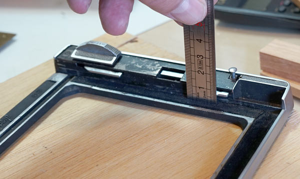 These four pieces will fit in the Graflok Back frame. The central span will be slightly larger than the span of the camera itself. But this can vary from one model to another. At Linhof it was about 5 and 3 mm larger at each edge, as shown in the picture above. Another point to note is that the height of the shortest pieces is 4 mm less than that of the longest. This is to create a gap through which the negative carrier will enter. This piece will go in and out on the back of the camera and so it cannot be very tight. Eventual light leaks in an enlarger are not as serious as in photographic cameras.