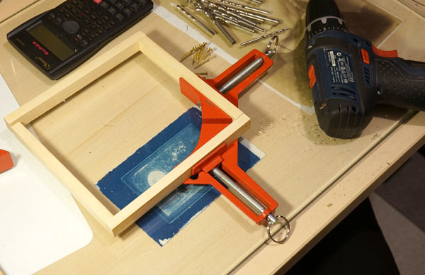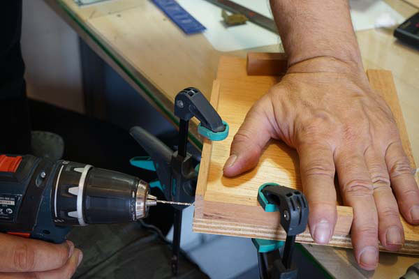 Now it’s the assembling. If you use only one screw, also use wood glue. Better a flat-head screw instead of a pan head as it must leave a smooth surface. Do not try to pierce the parts by holding them with your hands only. If you don’t have 90º clamps like the one in the photo below: