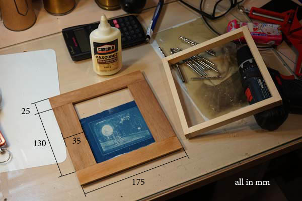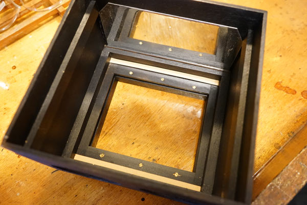 The external dimensions of this base are 180 x 175 mm. The internal measurements result in 130 x 100 mm, that is, the same 130 mm first frame, but narrower at 100 mm because the frame left 108 mm (see above). The reason for this narrowing along the side of the negative holder is precisely to form a frieze to hold it in position. On the right, in the photo above, is another frame that needs to be made and that will firm this base and serve as support for the walls of the box. Its thickness is not very critical. Use the slats that are within your reach. Anything from 10 to 15 mm will probably do. The external measurements must be 180 x 175 mm minus the thickness of the walls that you will be raising next.