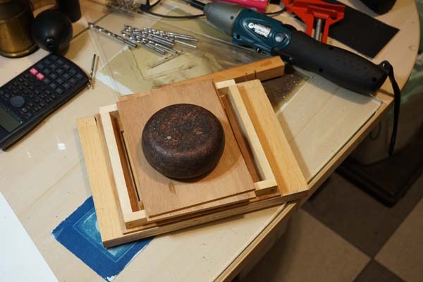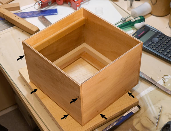 Essa base da caixa pode ser inicialmente apenas colada e deixada de um dia para o outro para secar completamente. É preciso colocá-la sobre uma base bem plana (foto acima), ajustar bem o posicionamento enquanto a cola estiver permitindo movimentos e colocar um peso em cima para que a cola penetre nas fibras da madeira.