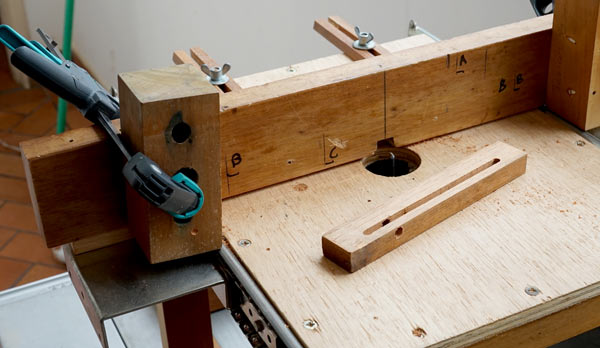 Use a very flat wooden board and secure the pieces with common clamps as in the photo below. Drill the thinnest hole into which the thread should catch and then loosen the back piece and drill the largest hole where the thread should run.