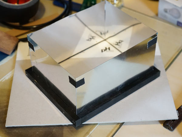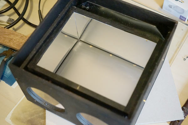 Inside the frame I fixed four polished aluminum walls with very small nails. Thus, the light that would be lost to the corners of the box is redirected to the diffuser.