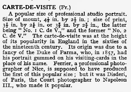In Cassell’s Cyclopaedia of Photography from 1911 we have the entry above. It shows the official dimensions of the carte de visite: