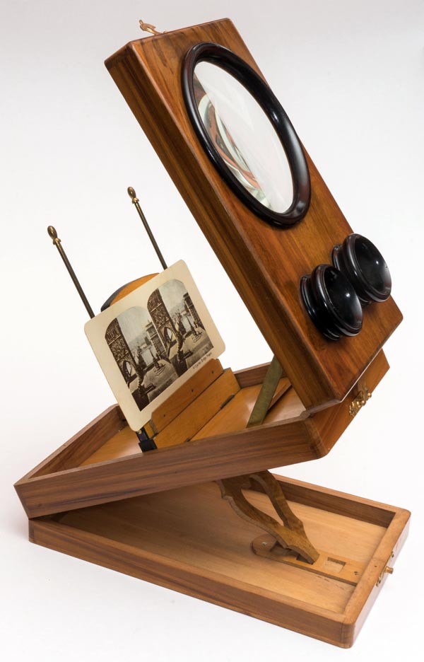 Most graphoscopes also featured the possibility to observe cards and photographs in three dimensions. Collecting three-dimensional images was another practice that gained strength with glass plates, as early as the 1860s, and lasted until the mid-twentieth century, mainly monuments, architecture and tourist attractions, but also nature, such as landscapes and animals, ethnographic presenting people and cultures outside the European axis and the erotic ones that today animate the auctions of old photographs commanding high prices. If it is difficult to describe the effect that cartes de visite or cabinet have when viewed through a magnifying glass, in the case of stereographs, another name for three-dimensional photos, you really only need to see to feel the impact that such a resource can cause, so banal that boils down to just showing two photos at the same time.