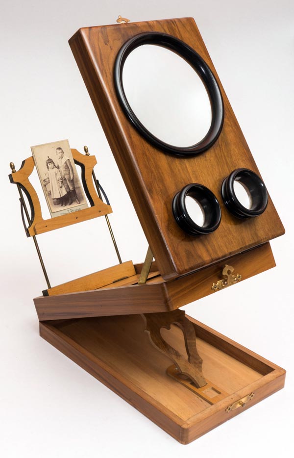 The Graphoscope was the ideal accessory to follow the multiplication of portraits that were exchanged between relatives and friends. From the 1860s onwards, there was a craze for these small portraits called carte de visite. They were made in professional studios and bought in sets that could run to many dozens, depending on the subject’s popularity and budget. The daguerreotype, being a unique piece, would not serve this purpose. Talbot’s process, by using paper as a negative, did not produce enough detail for such small prints as the texture of the paper overlapped them. It was the introduction of the glass negative with processes such as collodion and albumen printing that made this new photography product possible and a huge success.