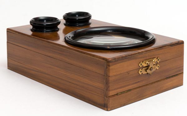 When closed, the graphoscope takes the form of a small box and can be easily stored in a bookcase or drawer. This is a simple model but there are some that, on the same principle, feature very refined marquetry work, gilded engraving or mother-of-pearl inlays.