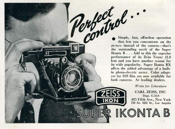 Roll-film camera lenses usually incorporate a shutter, that is, it was not something loose or installed in the camera body, as in focal plane shutters, for example. What was not consensus at the time is how it should be fired. Due to economy or inheritance of view cameras, this was often done by a trigger cable or directly on a small lever on the lens. Thus occupying a hand that could be helping to hold the camera firmly. These systems practically required the use of a tripod. It seems natural to us today that when holding a camera in order to look through its viewfinder and compose the photo, the shutter button should be right where our index finger is positioned. This was the condition imposed on the whole series of Ikontas and Super Ikontas. As the ad reproduced below, for a Super Ikonta B: “Perfect control – simple, effortless operation that lets you concentrate on the picture instead of the camera.”