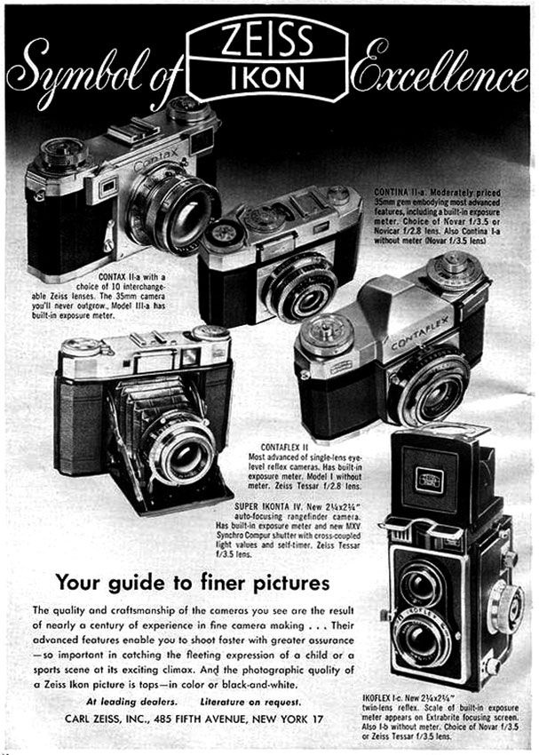 In this 1950s advertising we can look back over the major developments that would follow. TLRs (twin lens reflex) have always been the domain of Franke & Heidecke with Rolleiflex. They launched and knew how to explore the concept. Even though Ikoflex was an excellent camera, it was never strong enough in this market that would soon decline to give way to mid-format mono-reflexes. It was the turn of the Hasselblad and the like. Contaflex did represent the future, as it was a SLR (single lens reflex), a mono-reflex. But despite the many technologies and concepts that Zeiss Ikon had put into this category, theis insistence on using the shutter on the lens, it seems, was one of the factors that set her off competition. It was beaten by far by the Japanese Nikon, Canon, Pentax, Olympus, among others, with focal plane shutters. At Contina, we can see it in the generic category of viewfinder cameras for the amateur market. Zeiss Ikon had dozens of cameras for this segment and they were very successful around this time. But Zeiss again missed the segment to more daring point-and-shoot concepts such as Olympus Trip and Pen. The Contax range finder camera, a true “system” with all sorts of accessories for all types of photography, first-rate optics, has innovated at so many points but never reached the aura of Leicas and, anyway, both declined as a category. .